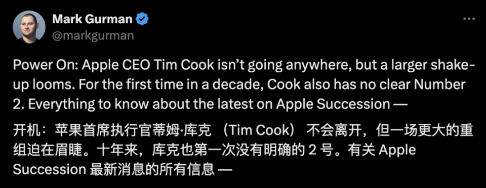 彭博社总编辑Mark Gurman最新爆料揭开了苹果内部的残酷真相:尽管深陷「史上最大AI危机」,65岁的Tim Cook还打算再干至少5年。