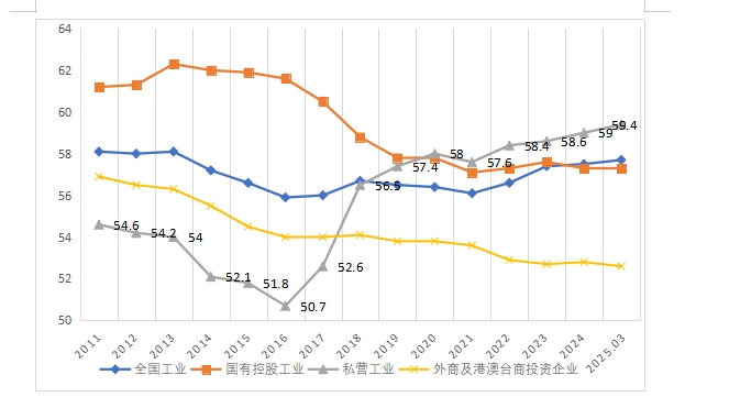 2025年3月末,私营工业企业的资产负债率高于全国工业平均水平,且在三类企业中最高。图1为2011年以来各类型工业企业资产负债率情况,可见私营工业企业资产负债率从2015年开始逐渐升高,并从2020年开始保持在较高水平,并始终在三类企业中最高。表明私营工业企业的债务负担相对较重,面临较大的经营压力。(详见图1)
