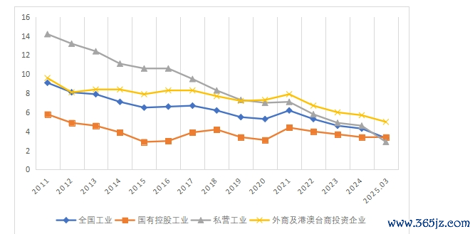 需要关注的是,十多年来私营工业企业资产利润率呈持续下降的态势,从2011年的14.2%下降到2024年的4.6%,今年3月末仅为2.9%,在三类企业中的排名也从最高且远高于国企和外企降至最低位。这些变化均表明近年来私营工业企业在生产经营上面临较大困难和压力,盈利能力日益恶化。(详见图2)