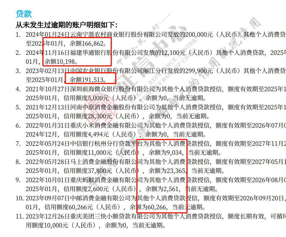 (1)信用卡透支率98%:9张卡总额度60万,可用余额不足1万;